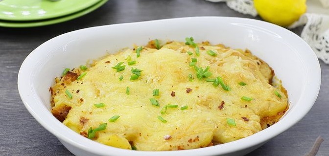 Картопляна запіканка з рибою та сиром під соусом бешамель