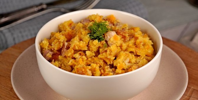 Така каша дуже корисна та смачна. За цим рецептом вона виходить ситною й апетитною. Кукурудзяна каша з куркою та гарбузом чудово смакує гарячою. Обов’язково подавайте таку страву на обід.