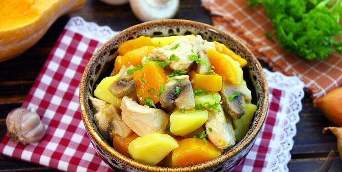 Цибулю та часник дрібно нарізаємо. Викладаємо на розігріту сковорідку та смажимо декілька хвилин. Потім додаємо нарізане індиче філе. Перемішуємо та продовжуємо готувати. Печериці, картоплю та гарбуз нарізаємо на шматочки. Відправляємо до решти інгредієнтів.