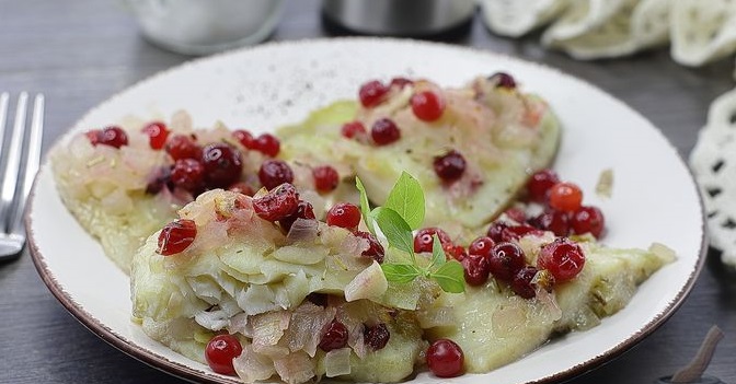 Філе риби нарізаємо на шматочки. Викладаємо на деко, застелене фольгою та змащене олією. Рибу солимо та перчимо. Зверху викладаємо смажену цибулю з журавлиною. Ставимо в духовку та запікаємо 30 хвилин при температурі 180 градусів. Смачного!