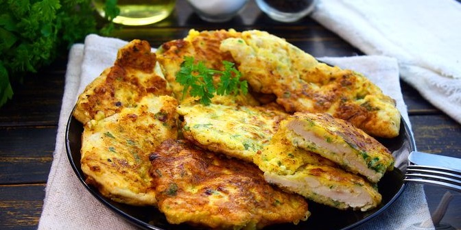Куряче філе нарізаємо на шматочки та відбиваємо. Потім солимо та перчимо з двох боків. В миску вбиваємо яйця. Додаємо сіль, спеції та збовтуємо до однорідності. До яєчної суміші всипаємо тертий плавлений сир. Потім додаємо борошно та нарізану петрушку.