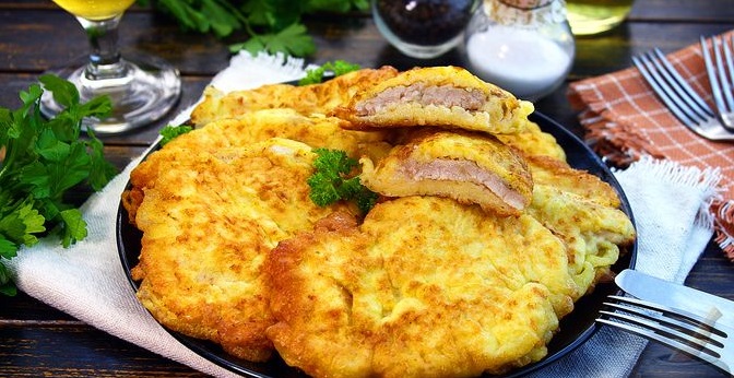 Картоплю варимо в мундирах приблизно 15 хвилин після закипання. Куряче філе нарізаємо на шматочки. Солимо та перчимо з двох боків. Плавлений сир натираємо, а цибулю нарізаємо соломкою. Яйця збовтуємо до однорідності. Додаємо сметану, плавлений сир та спеції. Перемішуємо.