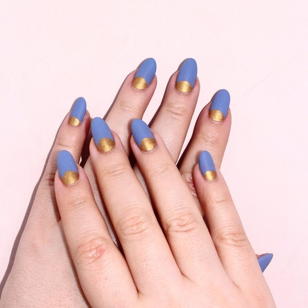 Золоті елементи у манікюрі стали справжнім трендом цього року. Покрийте нігті блакитним лаком, нанесіть матовий топ і виділіть лунку золотим лаком або глітером. Стильний манікюр готовий!