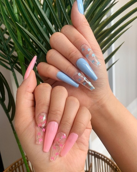 Поєднання блакитного та рожевого виглядає неймовірно ніжно. Радимо не наносити однотонне покриття на всі нігті та розбавити манікюр метеликами або іншими милими дизайнами чи наклейками таких самих відтінків.
