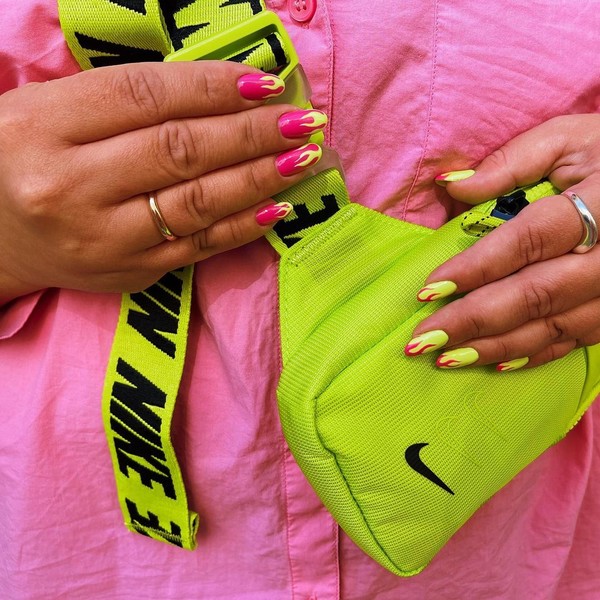 Цей варіант ідеально підійде для шанувальниць яскравого манікюру. Коли нанесете однотонне покриття, додайте полум’яний нейл-арт. З ним ви точно будете найгарячішою штучкою на будь-якій вечірці.
