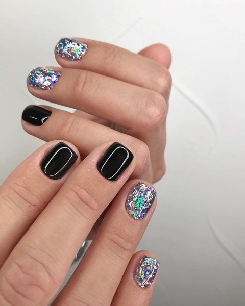 Манікюр із глітером — ідея для найсміливіших. У поєднанні з чорним блиском-лаком нігті виглядають максимально святково, так що з ним можна запросто відправитися на будь-яку вечірку. Зверніть на нього увагу, адже незабаром Новий рік!