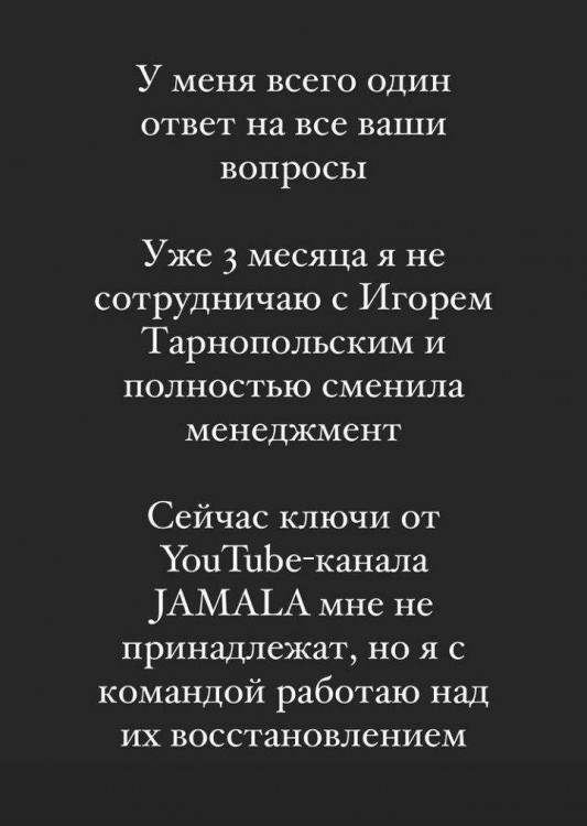 За словами Джамали, наразі її команда активно працює над відновленням кліпів. Артистка не повідомила, хто все-таки винен у видаленні її робіт. Зірка повідомила, що з продюсером Ігорем Тарнопольським не працює вже довгий час.
