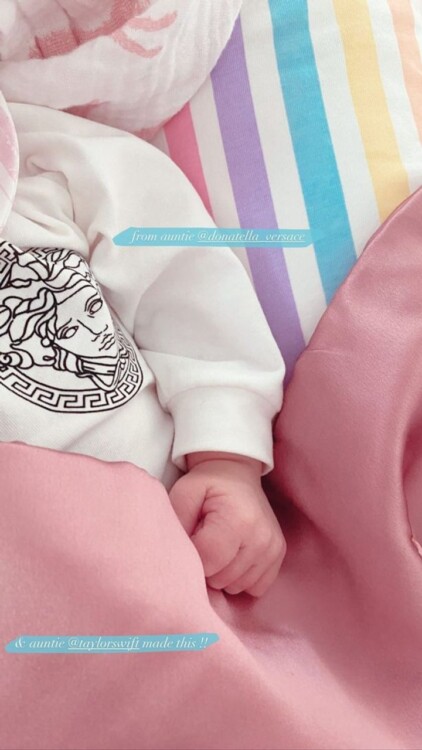 У своєму офіційному фотоблозі красуня довела, що на народження крихітки очікували не лише батьки, але й зірки з неймовірно гучним ім’ям. Так, подарунки для доньки Джіджі підготували американська виконавиця Тейлор Свіфт та голова компанії “Versace” Донателла Версаче.