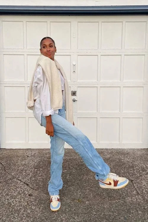 Невимушена посадка виглядає дуже круто, особливо якщо джинси дуже довгі. Додайте кросівки і футболку з малюнком, щоб повністю передати атмосферу повсякденності.