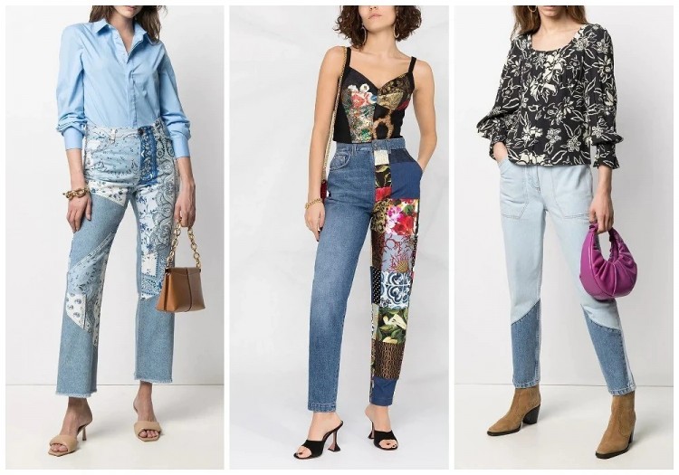 Один з найцікавіших трендів – джинси з комбінацією різних видів тканини. В одній парі може бути використаний як різний за кольором денім, так і інші матеріали, однотонні і з принтами.