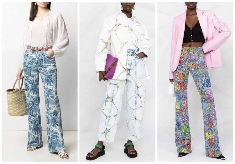 Яскравий літній тренд – джинси з малюнком. Принти можуть бути різними, яскравими і контрастними або виконаними в різних тонах одного відтінку, великими і дрібними.