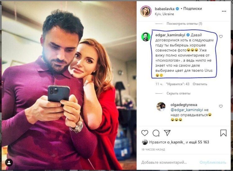 Свої слова він прокоментував так: «Давай домовимося хоч наступного року ти обереш гарне спільне фото. Вже бачу повно коментарів від “психологів”, але ж ніхто не знає, що насправді обираємо колір для твого Urus».