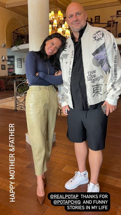 Перед камерою вона постала у стильних штанах бежевого кольору та темно-синій кофті. Ірина Горова позує поруч з Потапом, схиливши голову на його плече. Артист теж з’явився на святкуванні дня народження сина в ефектному вбранні.