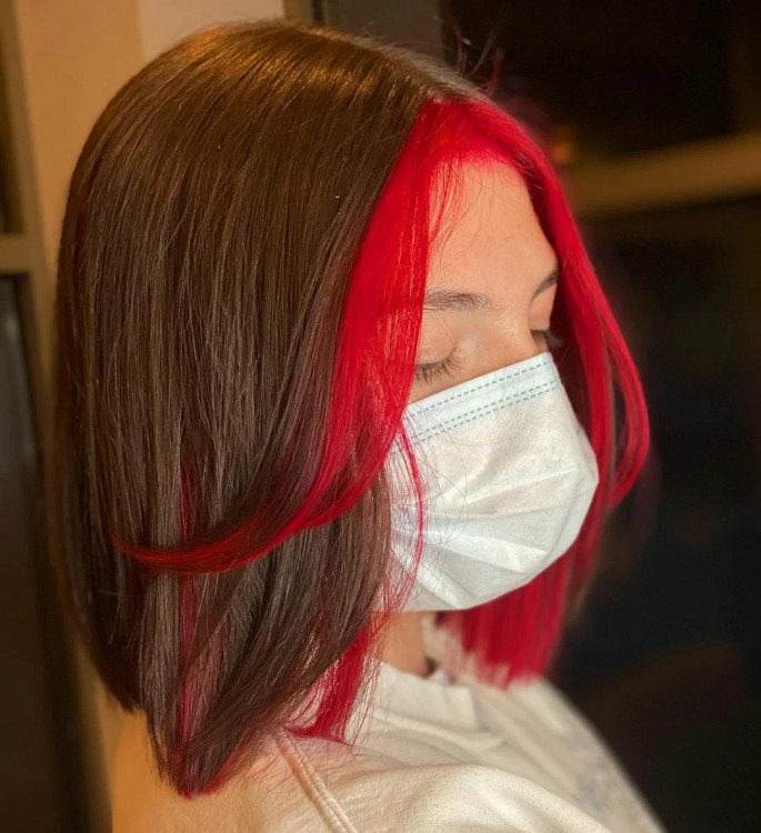 Стрижки з ультрамодним чубчиком «шторкою» стилісти пропонують прикрасити червоними відблисками. Найкраще зосереджуватися на певній ділянці волосся, як у наступному прикладі, коли акцентом став чубчик і кілька яскраво-червоних пасм біля обличчя.