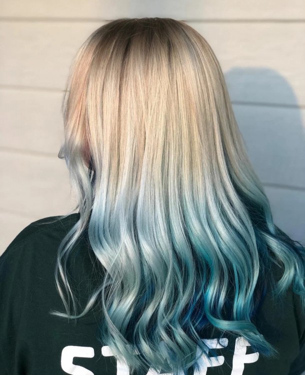 Забарвлення в складній техніці «омбре» – ще один варіант, який виглядатиме максимально виразно. У цьому фарбуванні світле волосся максимально змінилося за рахунок плавного переходу до незвичайного блакитного відтінку.