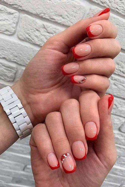 Створити максимально святковий вигляд манікюру допоможе червоний дизайн зі стразами. У такому виконанні французький манікюр зробить жіночі ручки максимально доглянутими, акуратними та сучасними.