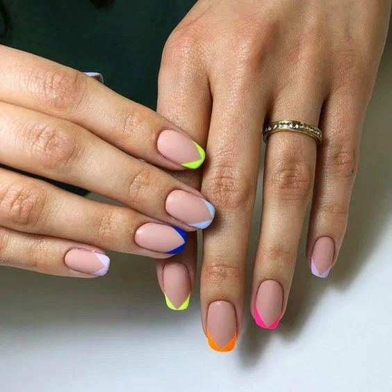 Перед вами французький манікюр у новій інтерпретації, саме таким його бачать сучасні нейлі майстри. Райдужний дизайн трикутної, а не напівкруглої форми + матовий фініш – шикарний тандем для леді, які завжди лише «за» незвичайні експерименти. У літню пору року чудовим рішенням буде використовувати на кожному пальці різні неонові кольори, вони зроблять ваші ручки більш засмаглими та виразними.