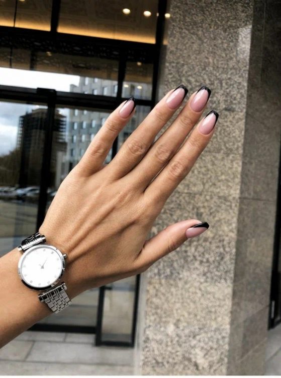 Французький манікюр у чорному кольорі – від такого дизайну складно відмовитись, особливо якщо ви любите мінімалізм. Нічого зайвого, просто замість білого окантування ми спостерігаємо в цьому дизайні насичено чорний, здавалося б, така незначна дрібниця але, незважаючи на це, манікюр виглядає максимально незвичайно.