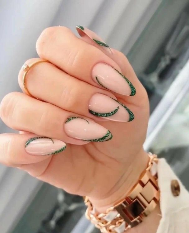 Ще один варіант манікюру зі світловідбиваючим лаком, до того ж смарагдового кольору. Як же гарно! А ще це френч тільки з одного боку.