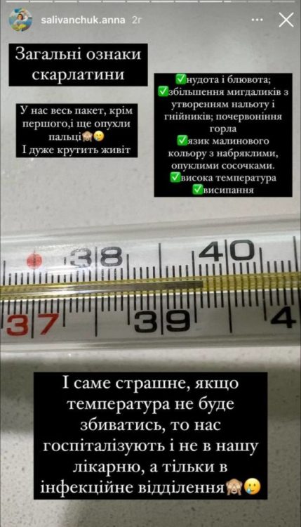 Ганна Саліванчук заявив, що в 3-річного Нікіти всі симптоми скарлатини. Якщо у хлопчика не спаде температура, то його доведеться госпіталізувати. “Ми з Микитою не спали всю ніч. Була температура, боліло горло і він плакав. Зараз у школах карантин через скарлатину і гепатит А. У Микити дуже болить горло і живіт. Температура 39,6, це просто жах якийсь. Я теж піду до лікаря, бо зовсім мені не подобаються мої мигдалини”, – відверто повідомила зірка українського шоу-бізнесу.