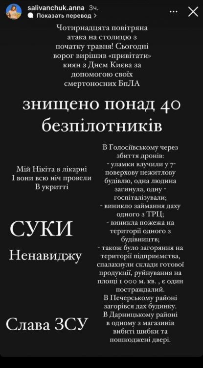 Ганна Саліванчук прокоментувала нічну атаку на Київ та повідомила, що її син перебуває в лікарні
