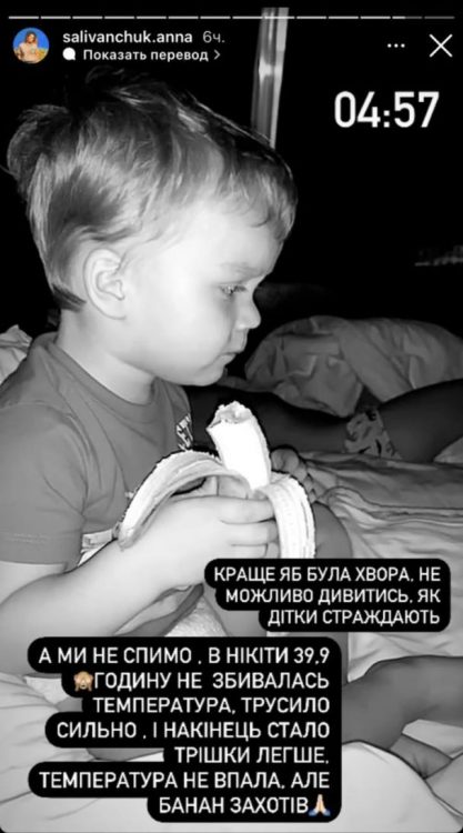 Також Ганна Саліванчук поділилась, що її 2-річний син майже нічого не їсть. Єдине, чого захотів хлопчик, це банан. Протягом години акторка ніяк не могла збити високу температуру в сина.
