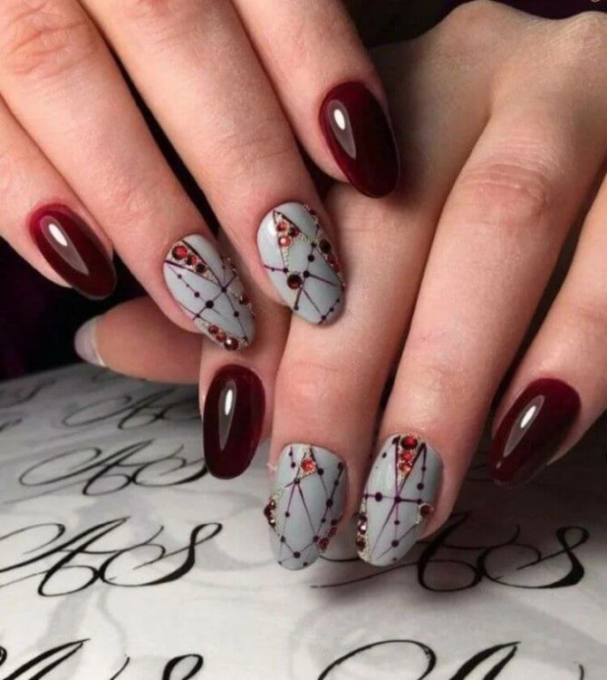 - манікюр зі смужками, геометричними фігурами і цяточками – різновид мінімалістичного дизайну, який може виглядати помітно і яскраво за рахунок додавання кольору;