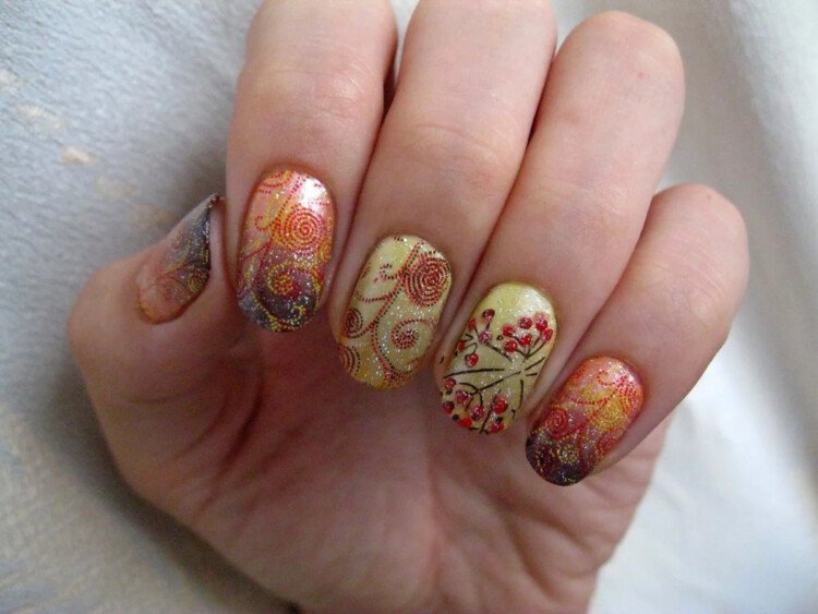 - манікюр з осінніми мотивами – це великий вибір осінніх малюнків, це і улюблені багатьма кленові листочки, краплі дощу, парасолі тощо;