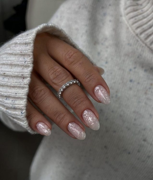 Великі і дрібні блискітки, акценти у вигляді металевого втирання, сяючий френч – вибирайте будь-який варіант. Можна навіть поекспериментувати з дизайном у стилі «різні руки», де нігті на одній руці залишаться в покритті без декору, а на іншій — з блискітками.