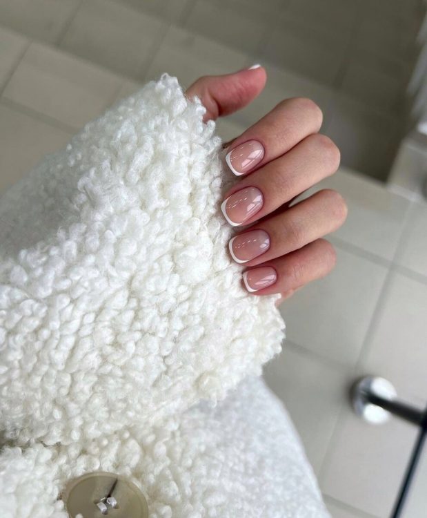 Це класичний французький манікюр з дуже тонкою смужкою. Виглядає такий дизайн чудово в будь-яких колірних рішеннях.