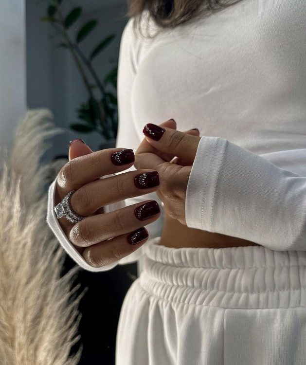 У моді як класичні відтінки лаку – чорний, червоний, білий, так і більш складніші. Гарно виглядатиме глянсовий манікюр у глибокому бордовому кольорі або, наприклад, у приглушеному зеленому.