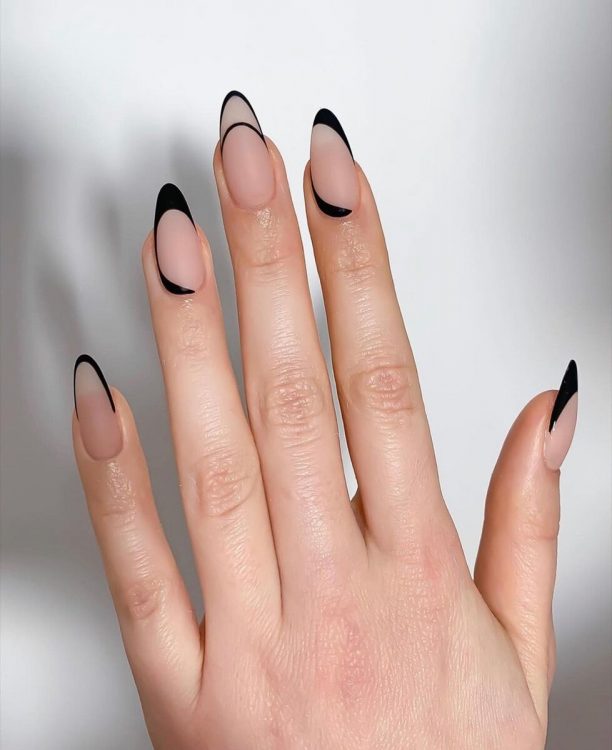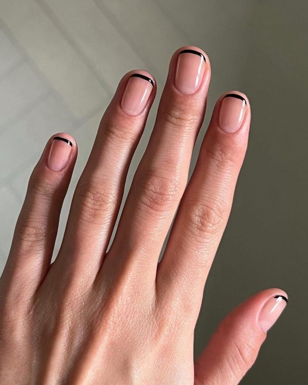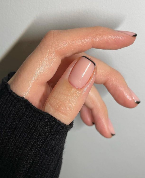 Класичний манікюр у новому прочитанні: вільний край нігтя забарвлюється не в білий, а в чорний колір. Нігтьове ложе при цьому за традицією залишають нюдовим. Замість чорного можна використовувати коричневий, вишневий чи хакі.