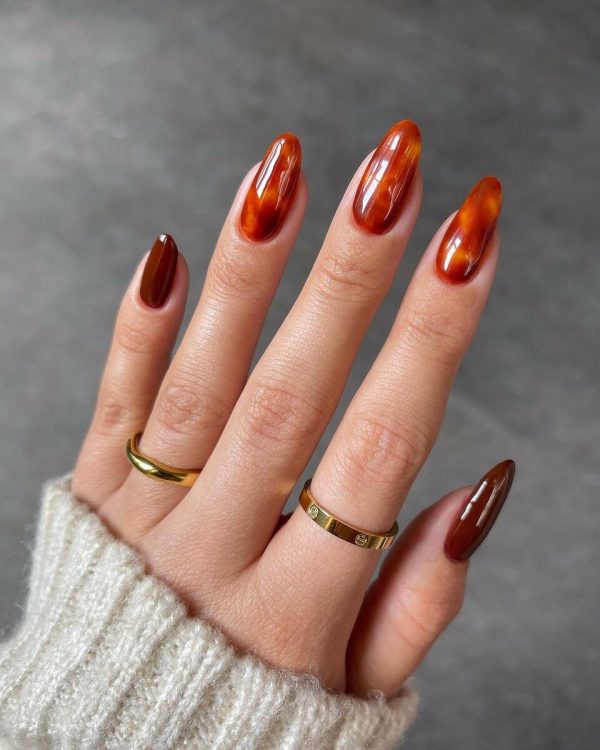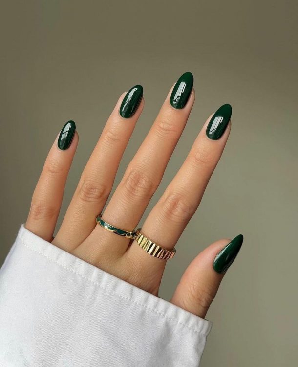 Хто сказав, що головні осінні кольори – це чорний та вишневий? В цьому сезоні актуальний насичений зелений, який добре поєднується з палітрою осінніх луків — від твідових пальт до затишних в’язаних светрів. Трендсеттери рекомендують доповнювати смарагдовий лак глянцевим топом та вибирати овальну форму нігтів.