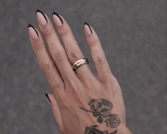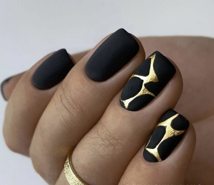 Тут теж є де розгулятися з дизайном. Чорний під матовим топом виглядає доволі розкішно. Органічно він дивиться на засмаглих руках. Урізноманітнити чорний лак можна тією ж поталлю і поєднати два тренди відразу.
