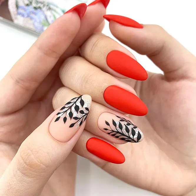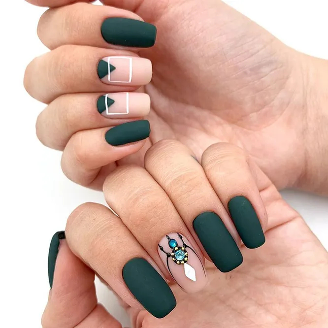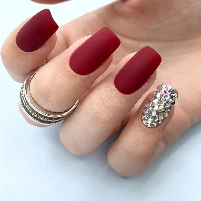 Матове глибоке покриття виглядає дуже тепло та витончено. Для нього можна вибрати будь-який відтінок – від класичного червоного до теплого смарагдового. Його можна доповнити стразами, блискітками або міксувати з глянсовим гелем-лаком. Варіант, який підійде для будь-якого дрес-коду, — поєднання одного-двох оксамитових нігтиків із трьома-чотирма глянцевими.