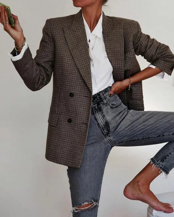 Подбайте про те, щоб у вашому базовому весняному гардеробі обов’язково був однотонний або принтований жакет оверсайз розміру. Жакет – це чудова річ, яка може замінити верхній одяг, а також стати невід’ємною деталлю мінімалістичного образу. Зверніть увагу, що оверсайз жакети додатково роблять фігуру струрнкішою та тендітнішою.