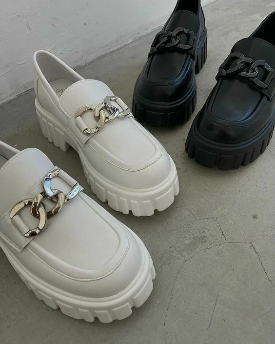 Вибираючи відповідне універсальне взуття на весну 2022 зверніть увагу на лофери. До актуальних відносяться моделі на масивній тракторній підошві, з акцентною фурнітурою, з круглим або гострим носом.