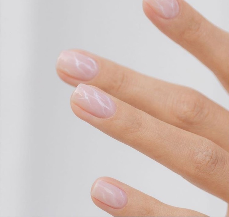 Мармуровий манікюр – один з найбільш затребуваних дизайнів. Особливо красиво він виглядає в пастельних нюдових тонах – красиво, незвично, привертає увагу. Але дуже важлива техніка виконання, щоб покриття нагадувало саме мармур, а не виглядало потріскагим, рука майстра повинна бути набита. До речі, мармуровий малюнок відмінно підходить коротким нігтям.