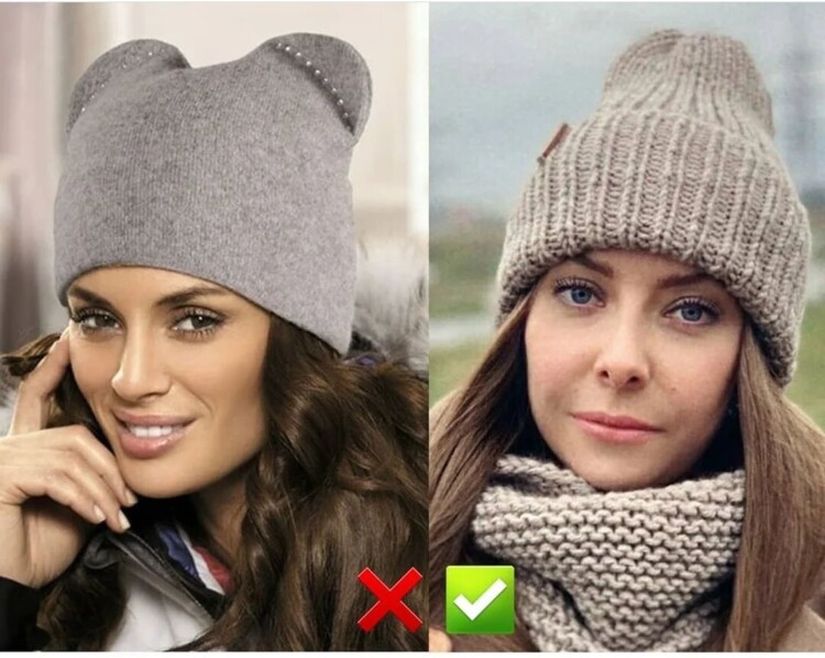 Зліва на фото не актуальна шапка: вона занадто тонка і сидить в обтяжку. У такому головному уборі голова здається дуже маленькою, не пропорційною тілу, особливо на тлі об’ємного верхнього одягу. Міняємо її на більш структуровану шапку, яка добре тримає форму і додає об’єму.