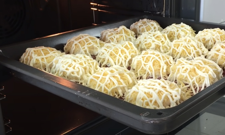 Наступним шаром розкладаємо натертий сир, підійде будь-який. Щоб сир не пригорає, зверху робимо сітку з майонезу. Ставимо деко в розігріту до 180 градусів духовку на 30-40 хвилин.