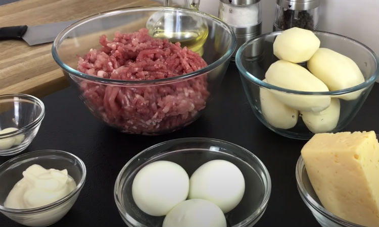 На 600 грамів свинячого фаршу беремо 400 грамів картоплі, 300 грамів ріпчастої цибулі, 150 грамів твердого сиру, пару відварених яєць, 2 зубчики часнику, 50 грамів майонезу, трохи рослинної олії. Сіль, перець і інші спеції можна брати за смаком.