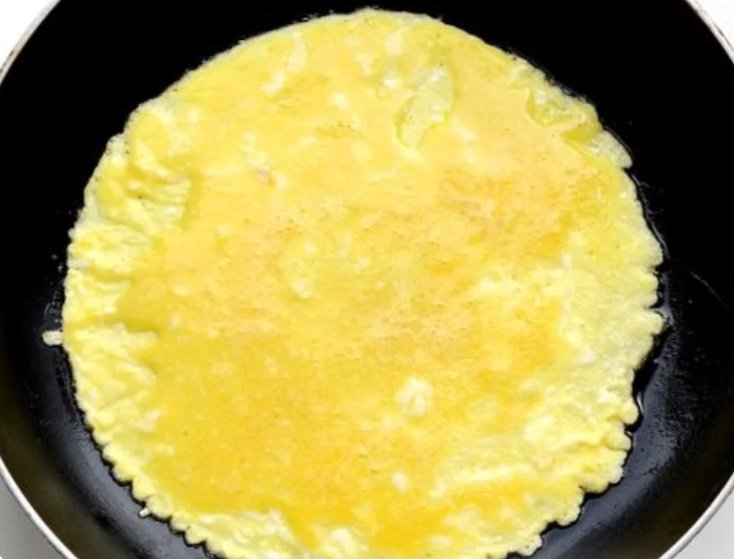 2. У сковороді на середньому вогні розігріваємо олію. Вливаємо яєчну суміш і розподіляємо по дну формуючи тонкий млинець і смажимо на середньому вогні 1-2 хвилини.