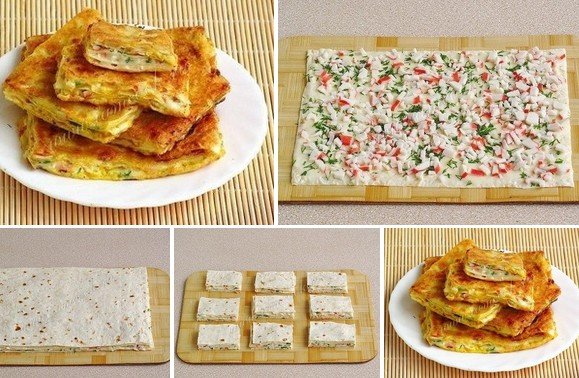 Палички закрити другим шаром лаваша. Повторити заповнення начинкою на другому і третьому пластах.