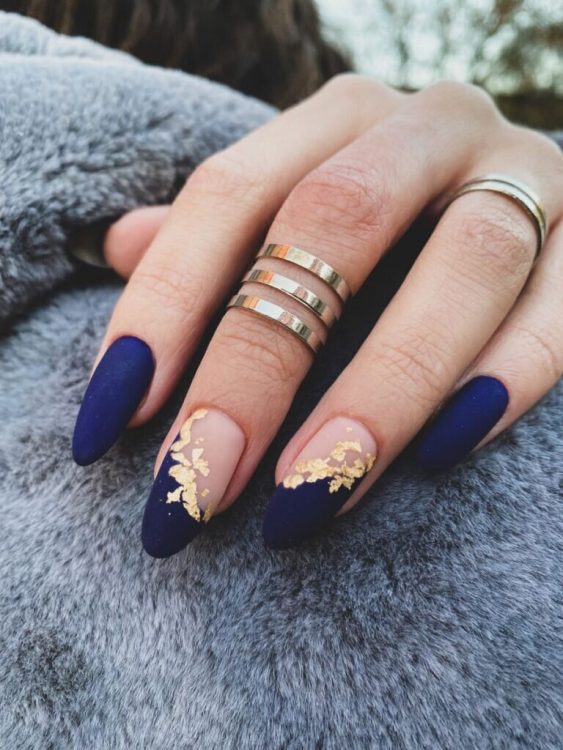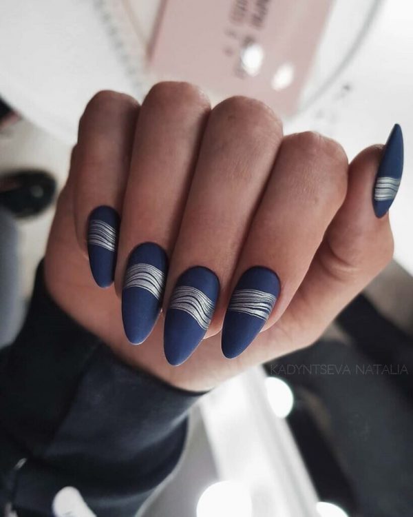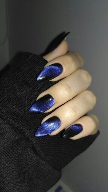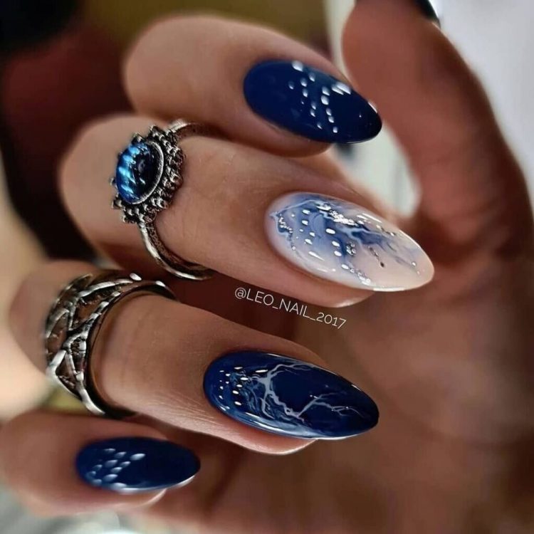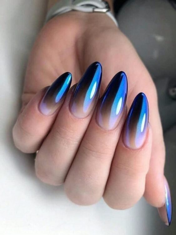 Одним з найефектніших і найпопулярніших варіантів дизайну нігтів у синіх відтінках є варіант із дзеркальним втиранням, який чудово виглядає на довгих нігтях мигдалеподібної форми.