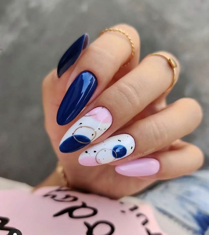 Чудовим рішенням буде створити комбінацію глибокого синього кольору з природним бежевим або рожевим, а в якості акценту можна додати трохи м’якого золотистого блиску.
