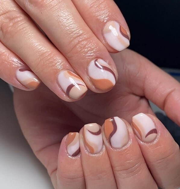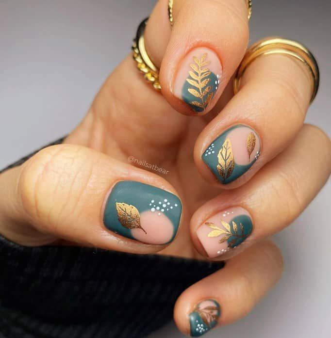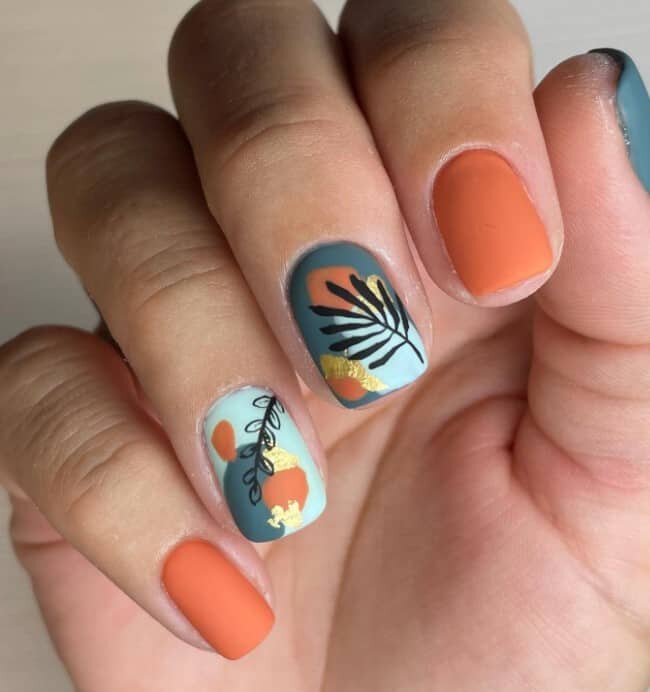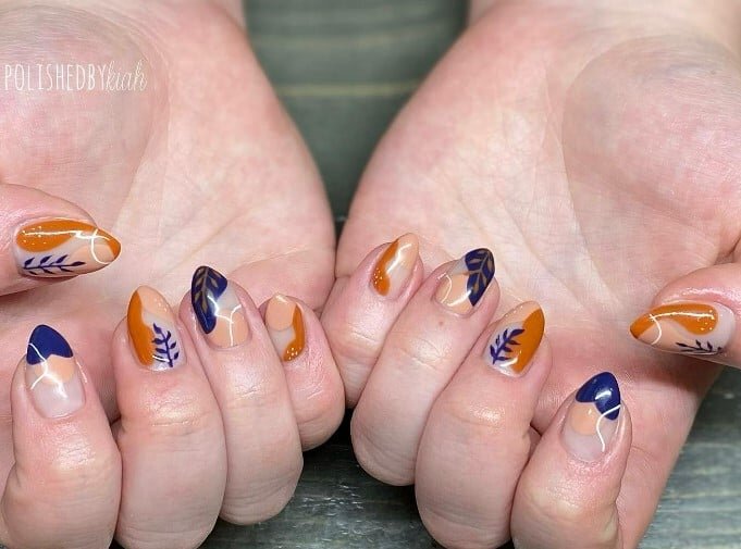 Цей манікюр є поєднанням прохолодних синіх тонів з теплими оранжево-коричневими і бежевими відтінками, доповнене візерунками з листя і абстрактних плям.