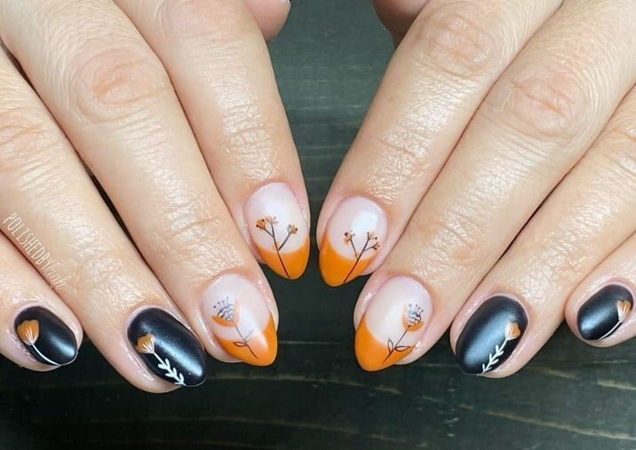 Додайте пікантності вашим нігтям, поєднавши в одному дизайні оригінальний френч з мандариновими кінчиками, оздобленими квітковими гілочками, і чорне хромоване покриття, також декороване мініатюрними квітами.