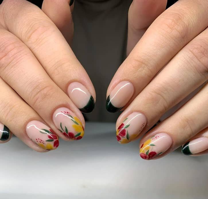Земляно-зелені французькі кінчики надають манікюру певного шарму, а витончений квітковий принт додає нотку жіночності та грайливості.