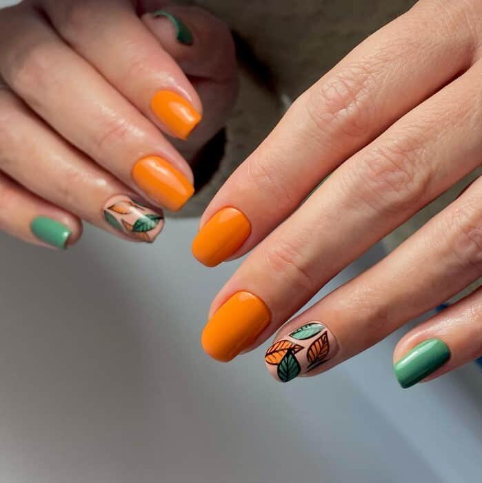 Як основні кольори в цьому дизайні використовуються яскраво-жовтогарячий і приглушений зелений. Акцентні нігті прикрашені малюнками у вигляді осіннього листя у тій самій палітрі.