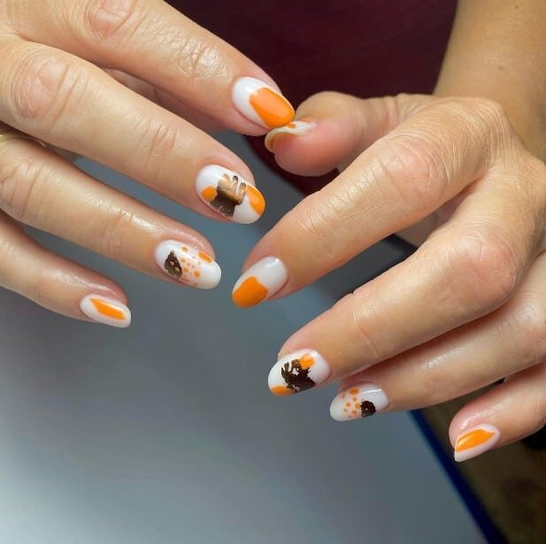 Перетворити прості білі нігті на чудовий осінній манікюр можна, просто прикрасивши кожен з них абстрактними помаранчевими плямами та декором із бронзової фольги. Ви отримаєте сучасний, модний та витончений дизайн.